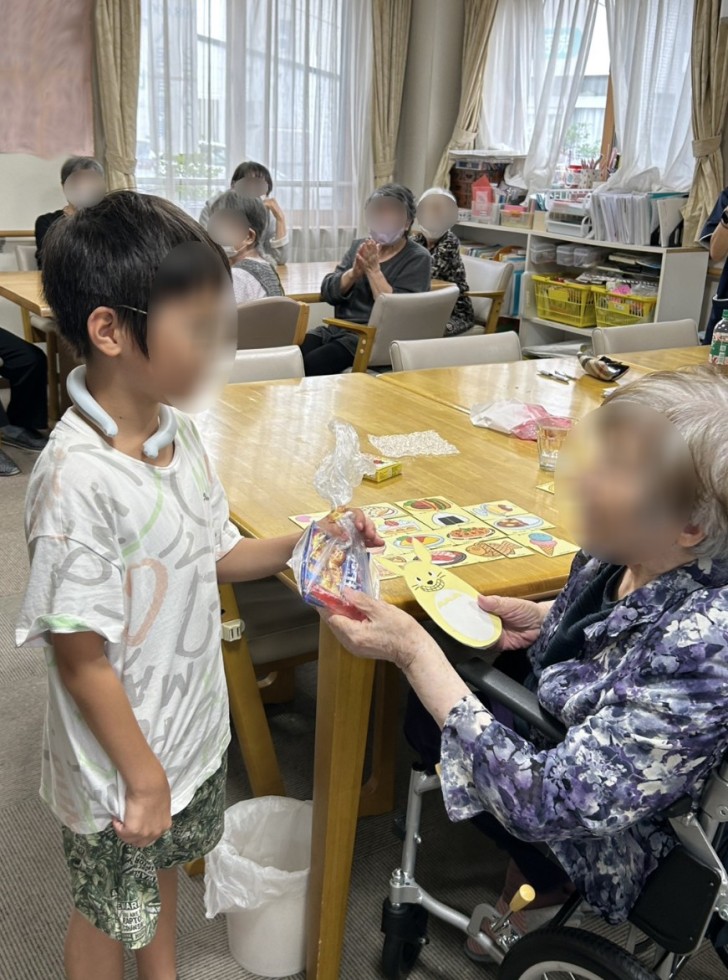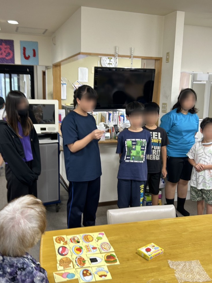 一緒にお菓子を食べたり、オセロ、絵合わせカード、ビンゴ、おはじきをしたり