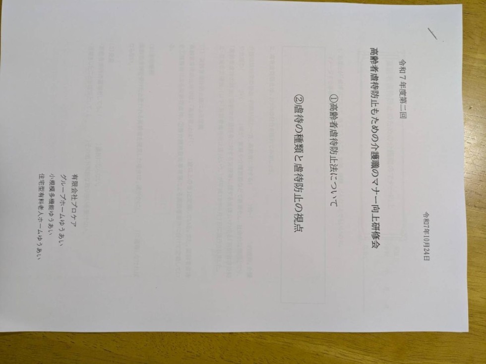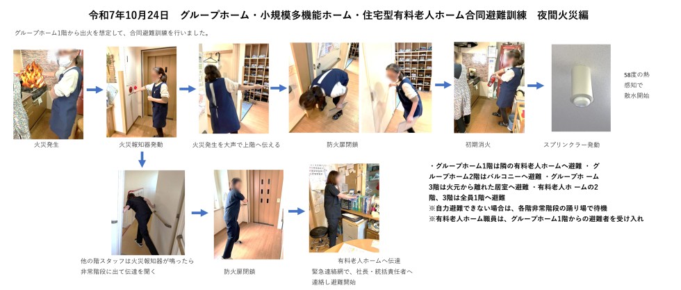 令和7年10月24日にグループホーム・小規模多機能ホーム・有料老人ホームの3施設合同で、出張研修、高齢者虐待防止員会、避難訓練を行いました。